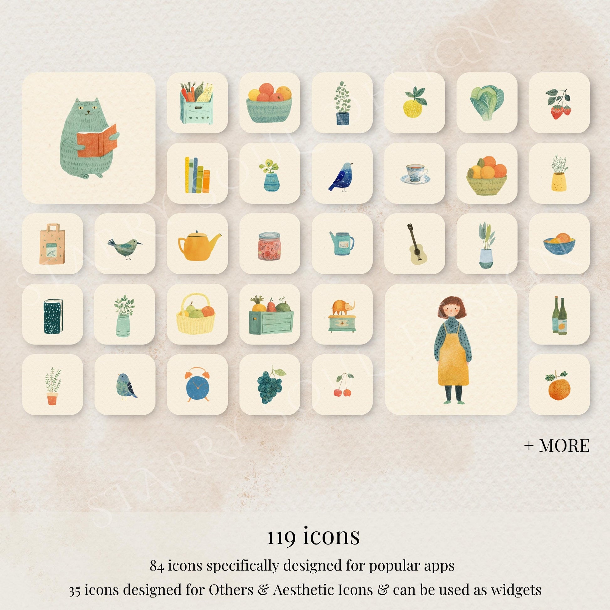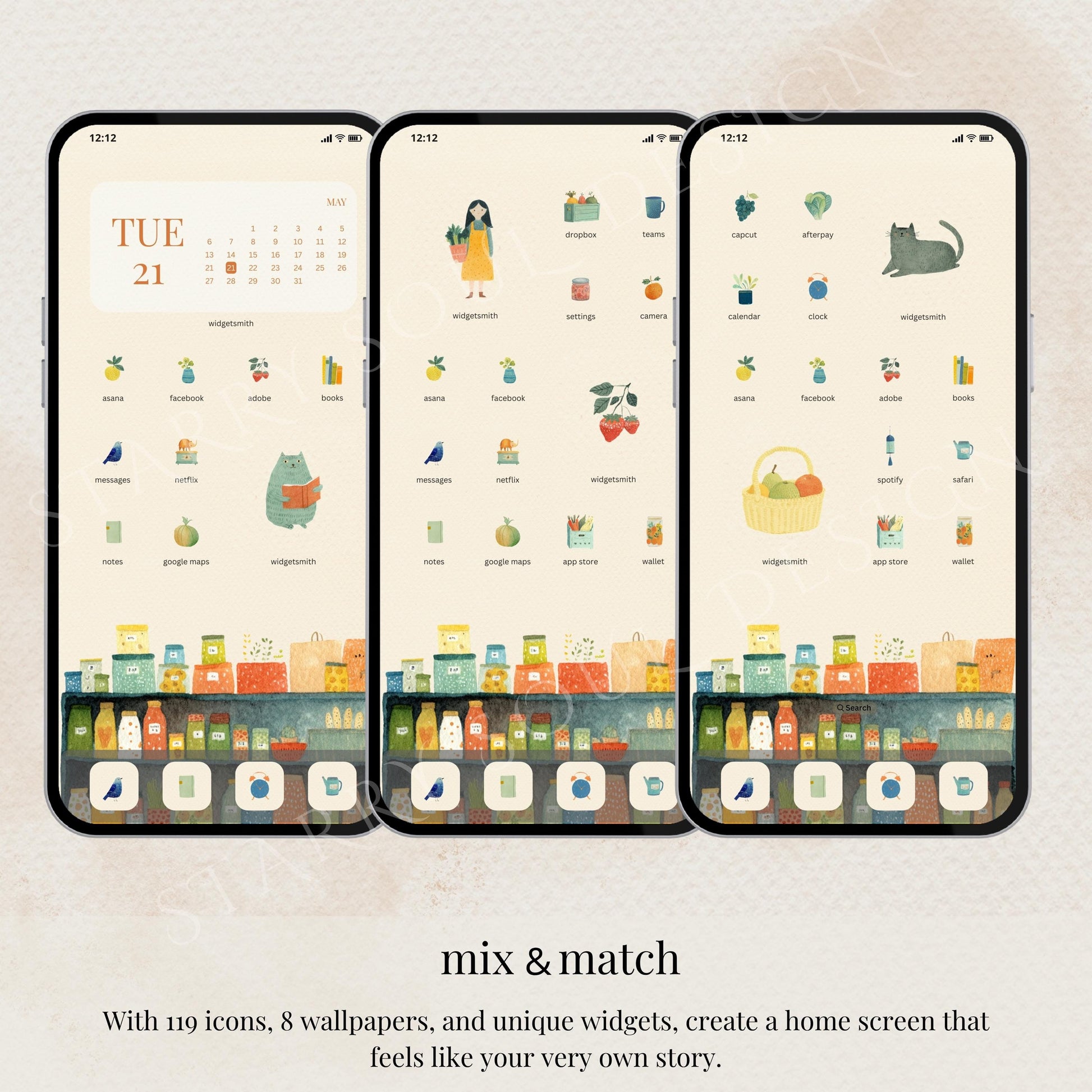 Transform your phone into a dreamy little market run by the sweetest girl in town. This whimsical iOS icon pack features hand-drawn watercolor fruits, veggies, houseplants, and cozy corner-store vibes – everything you’d find in a charming organic grocery shop!