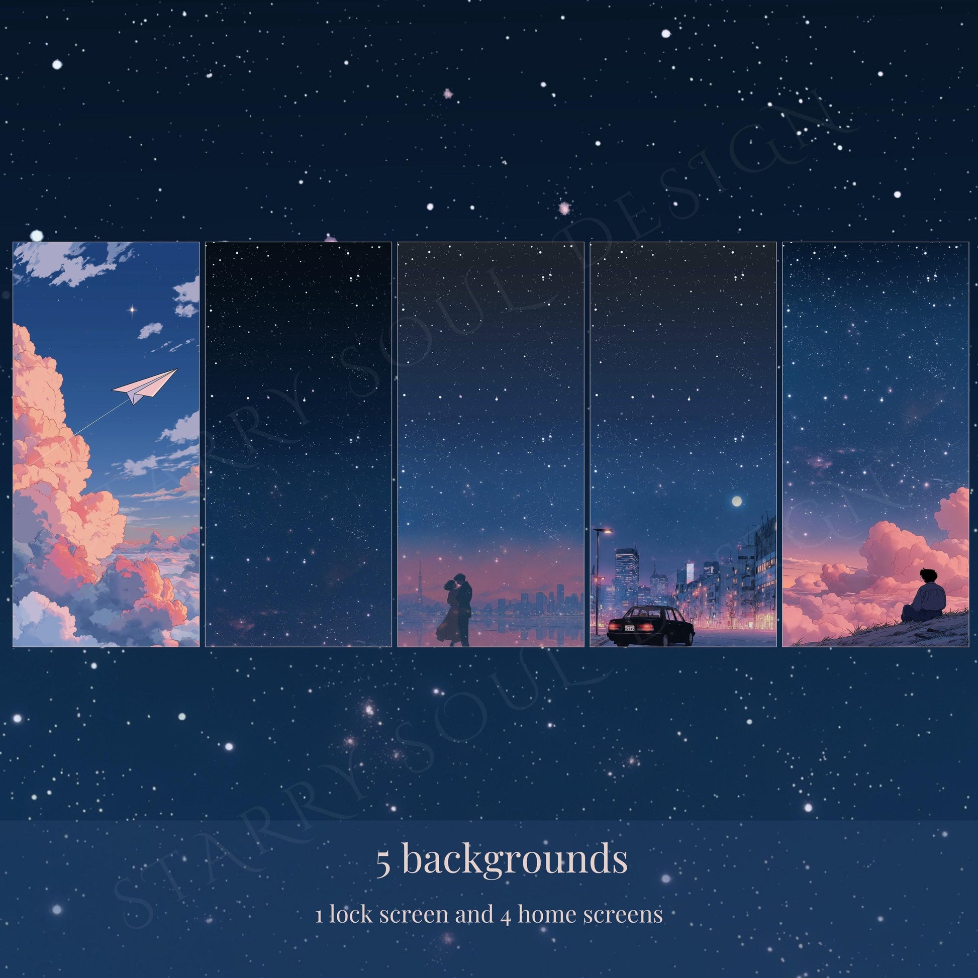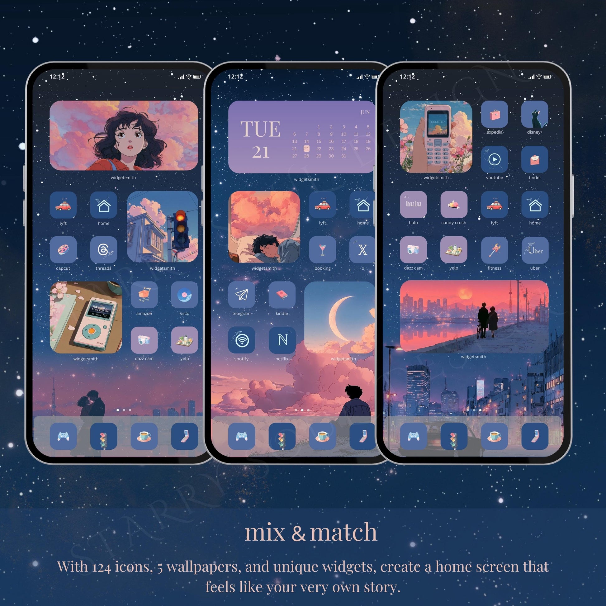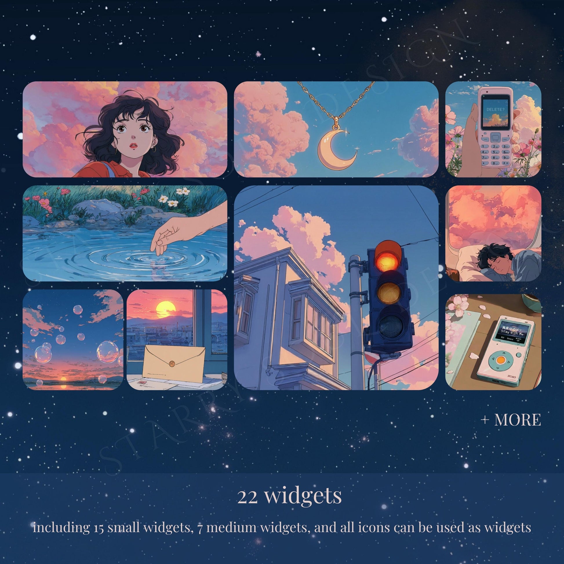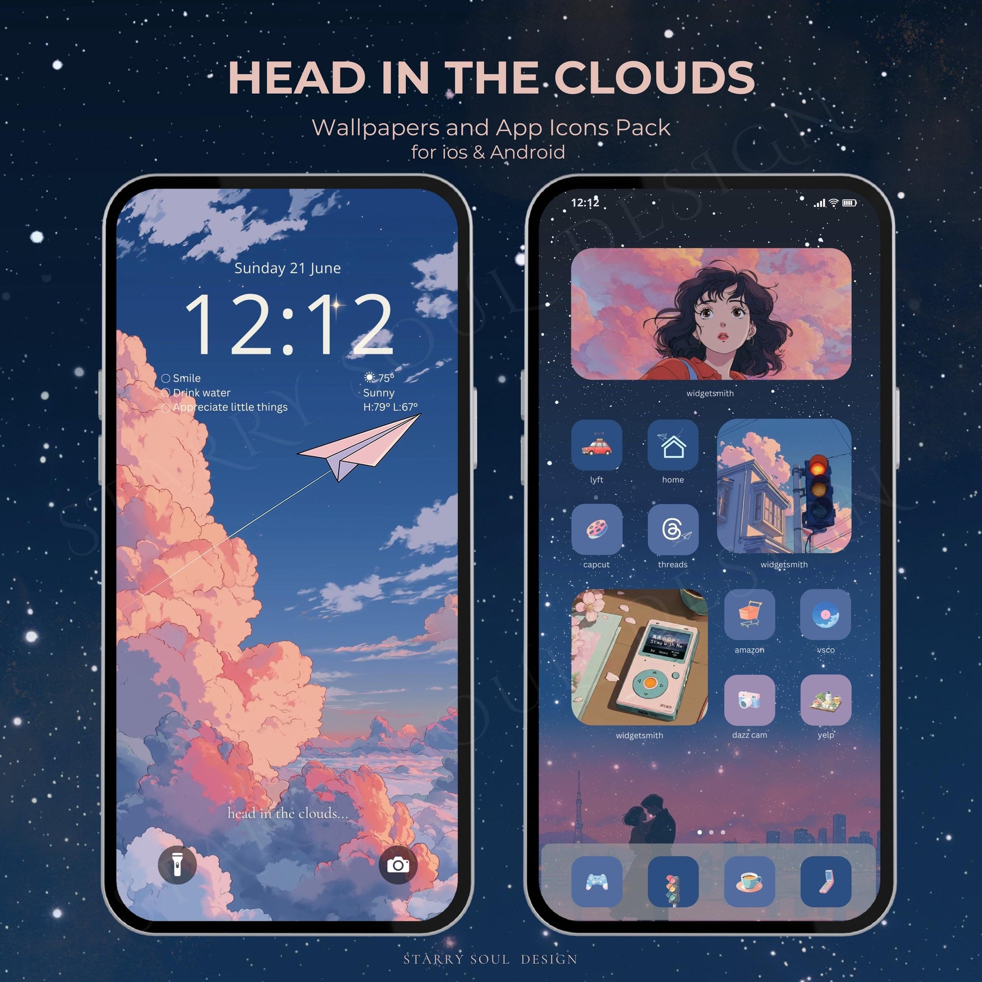 Our Head in the Clouds App Icon & Wallpaper Pack is inspired by retro Japanese anime, nostalgic city pop aesthetics, and the soft lofi mood of pink clouds and blue skies. Perfect for anyone who loves cozy vintage vibes and wants their phone to feel like a dreamy retro anime scene.