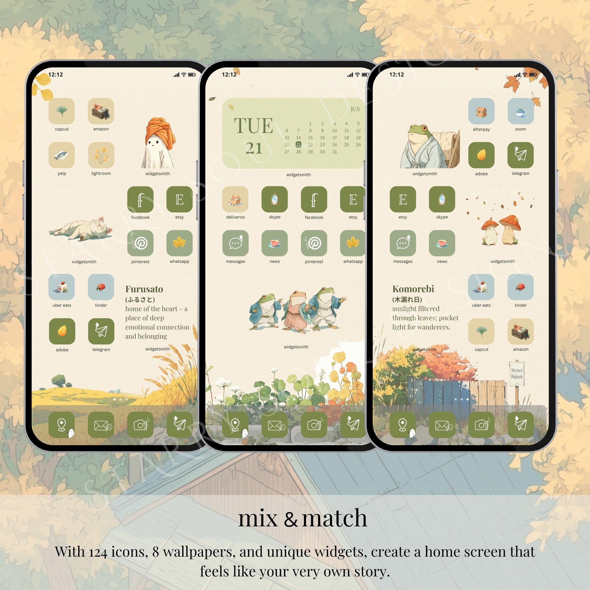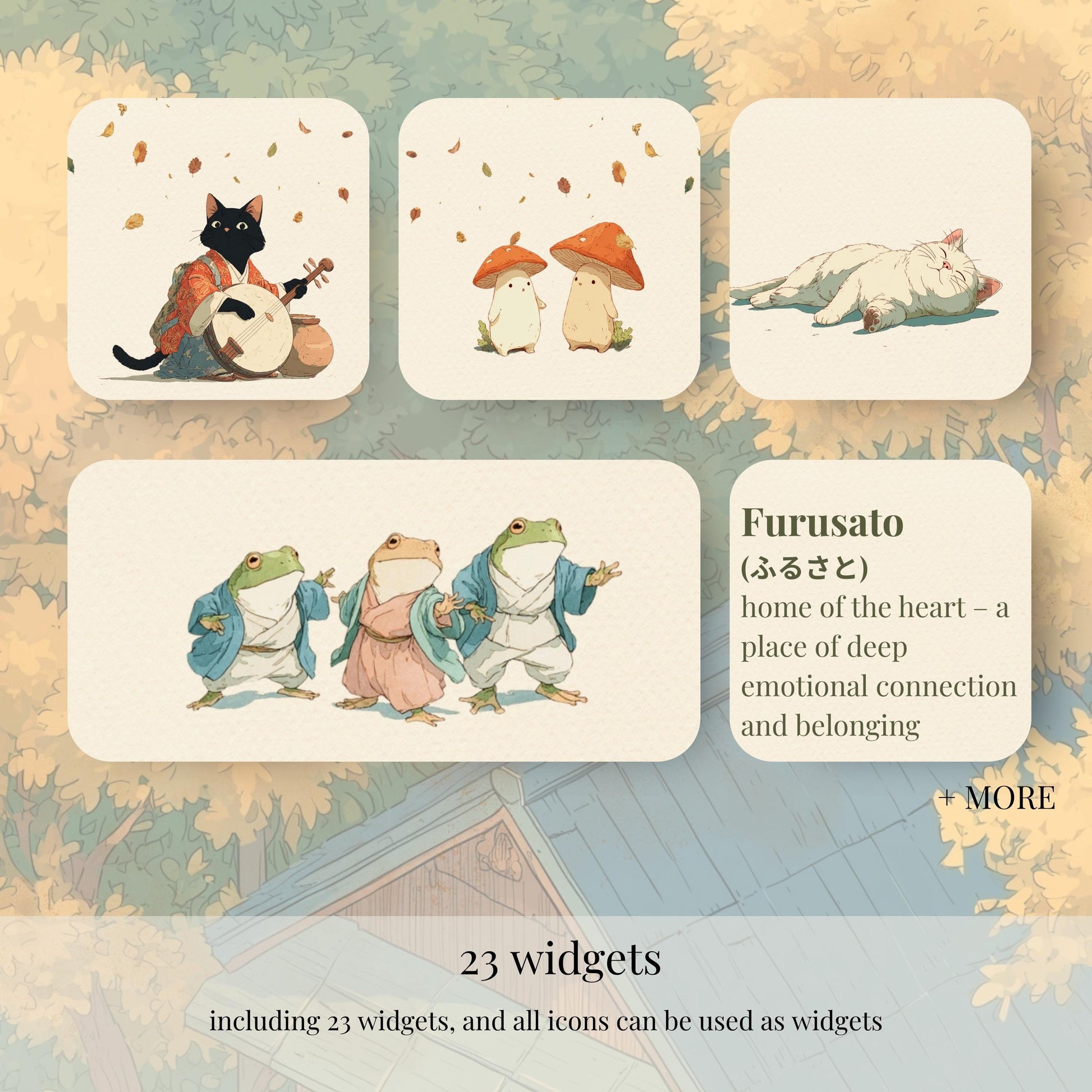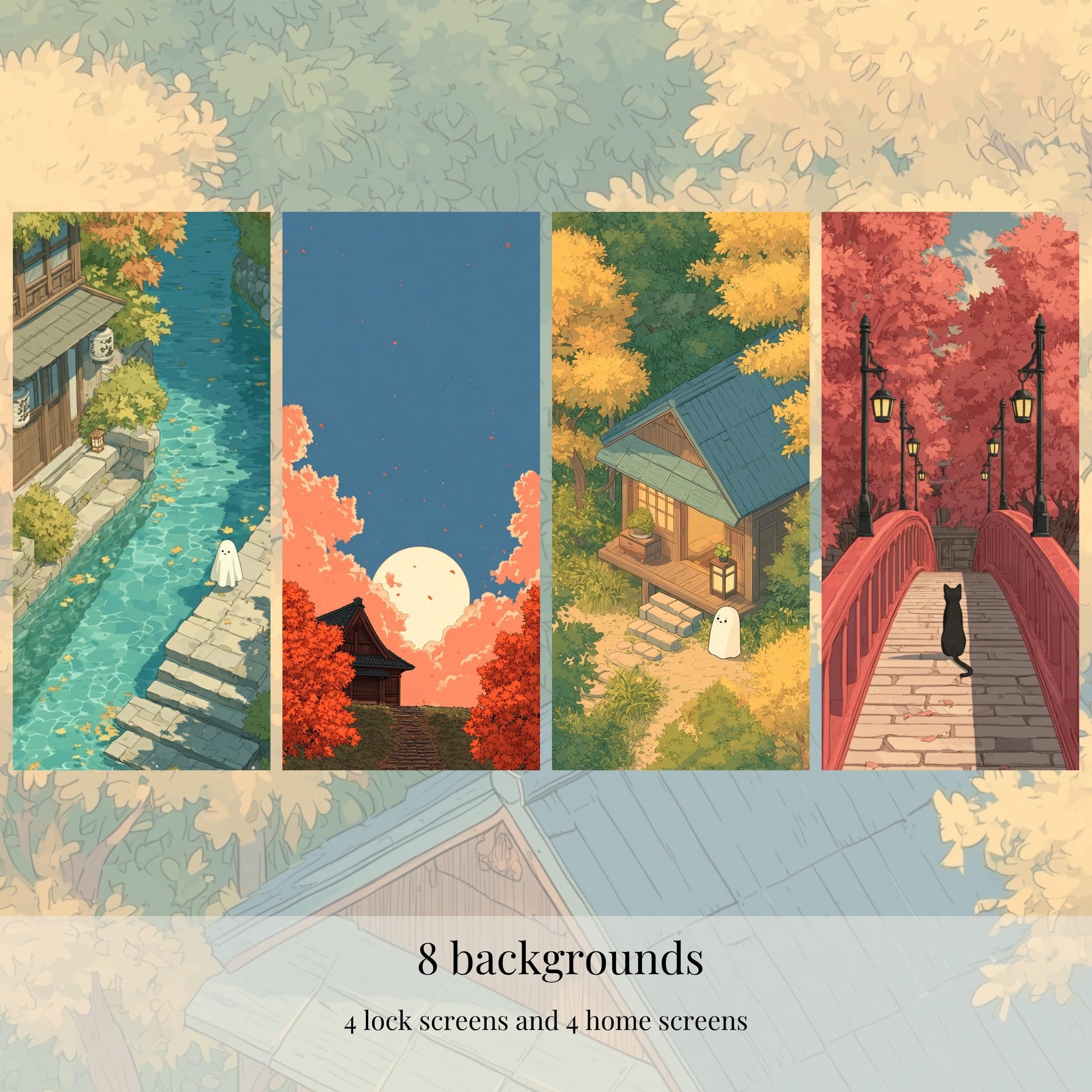 āØa cute, cozy anime icon pack inspired by Studio Ghibli vibes. A friendly monster village in autumn, lanterns at dusk, tea steam, maple leaves, and a hint of Halloween magic. Minimal watercolor icons on pure white backgrounds keep your home screen clean and elegant while still feeling whimsical and adventurous.